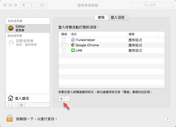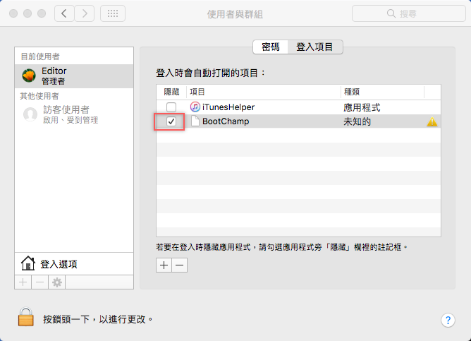 「登入項目」底下就是目前登入時會自動打開的項目,如果不想顯示可以勾選讓它隱藏。