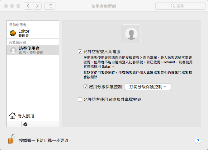 是否允許訪客使用者、共享資料夾限制也是在這裡勾選,另外像是「分級保護控制」也要在這裡啟動後,再進一步設定內容。