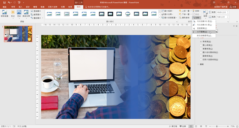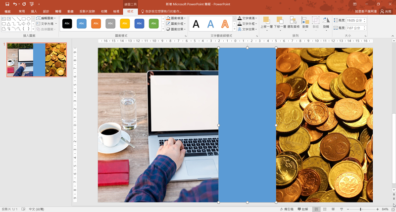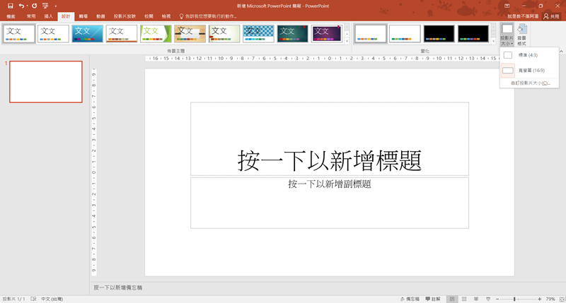 開啟 PPT 後新增一張空白投影片,並確認版面設置為 16:9。
