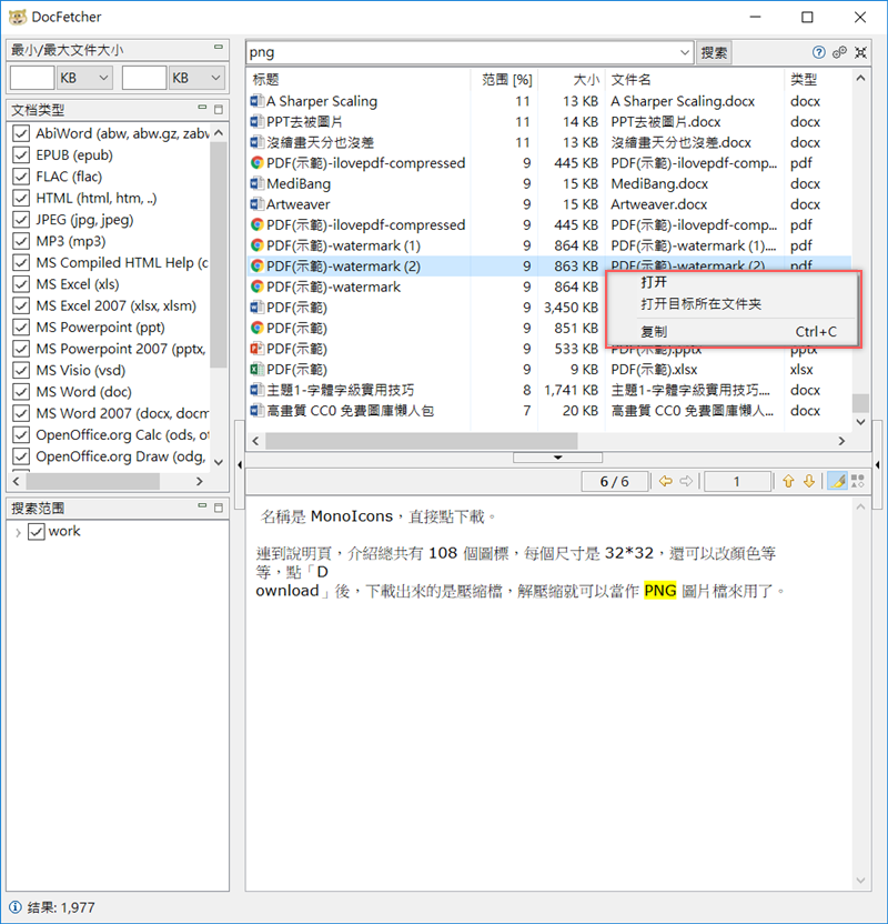 建立好搜索範圍,之後就可以依這個路徑去找會更準確,當然也可以依類別多創建幾個索引,接著來輸入關鍵字例如「png」,結果會將 png 檔、標題、內容有「png」(含大小寫)的都過濾出來,並在下方顯示詳細內容。