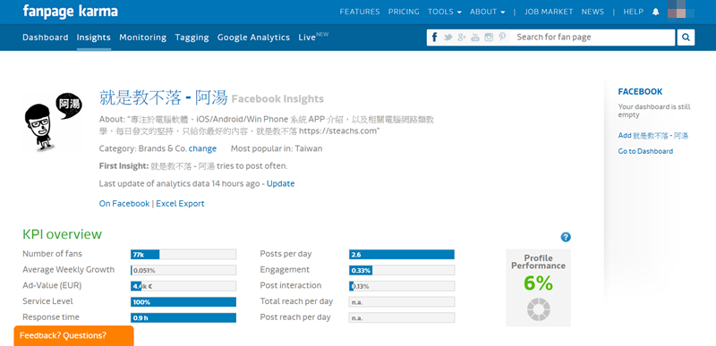 或要求登入臉書帳號後再選擇經營的粉絲團,然後就會顯示出各項成效,像是粉絲數量、每周增長比例、廣告效應、訂閱、互動等,很值得參考。