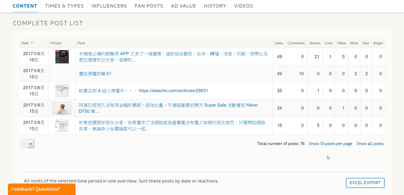 然後就可依時間觀察貼文的成效,讚數、分享數與影響範圍等等。