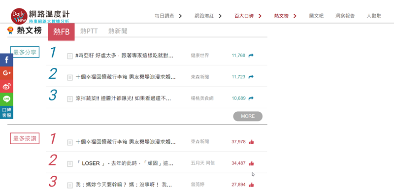 還有各大社群網站的熱門文章標題與類別,也會顯示按讚和分享數字供參考。