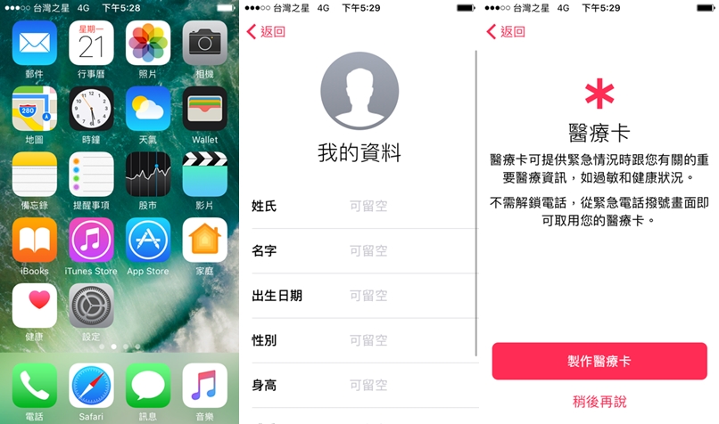 進入內建的「健康」APP,可跳過編輯個人資料步驟直接點「製作醫療卡」。