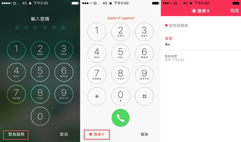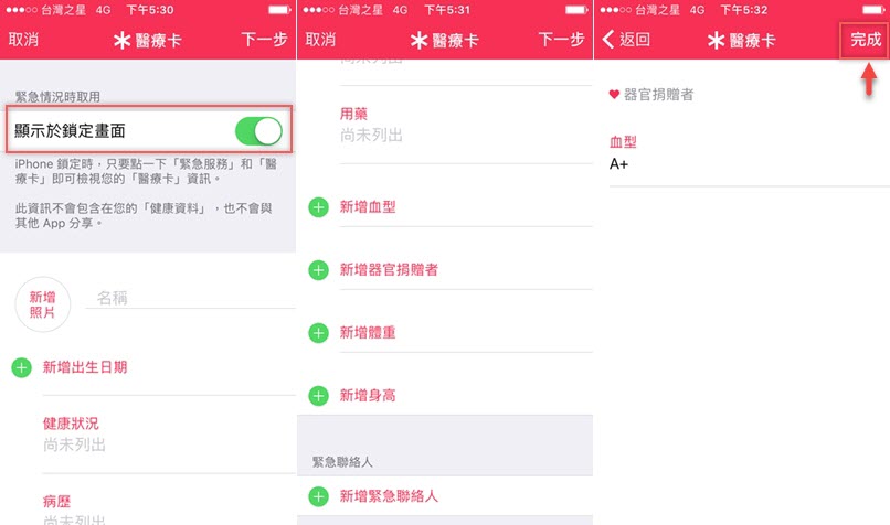 注意一定要開啟「顯示於鎖定畫面」才會發揮功效,然後就可以加入你的個人訊息,像是健康狀況、病歷、用藥,如果身體很健康無任何問題,建議基本的「血型」一定要填(會提供陽性與陰性選項,一般人都是陽性),如果有填過器官捐贈卡也能附註。