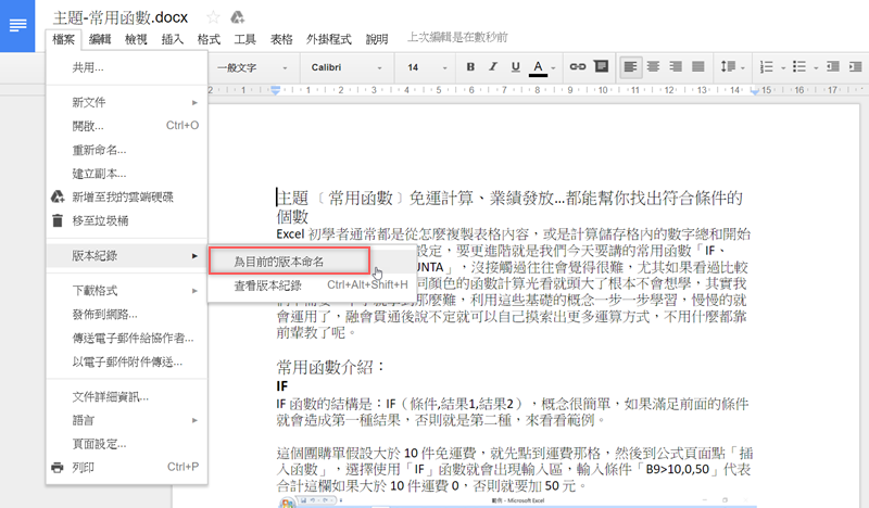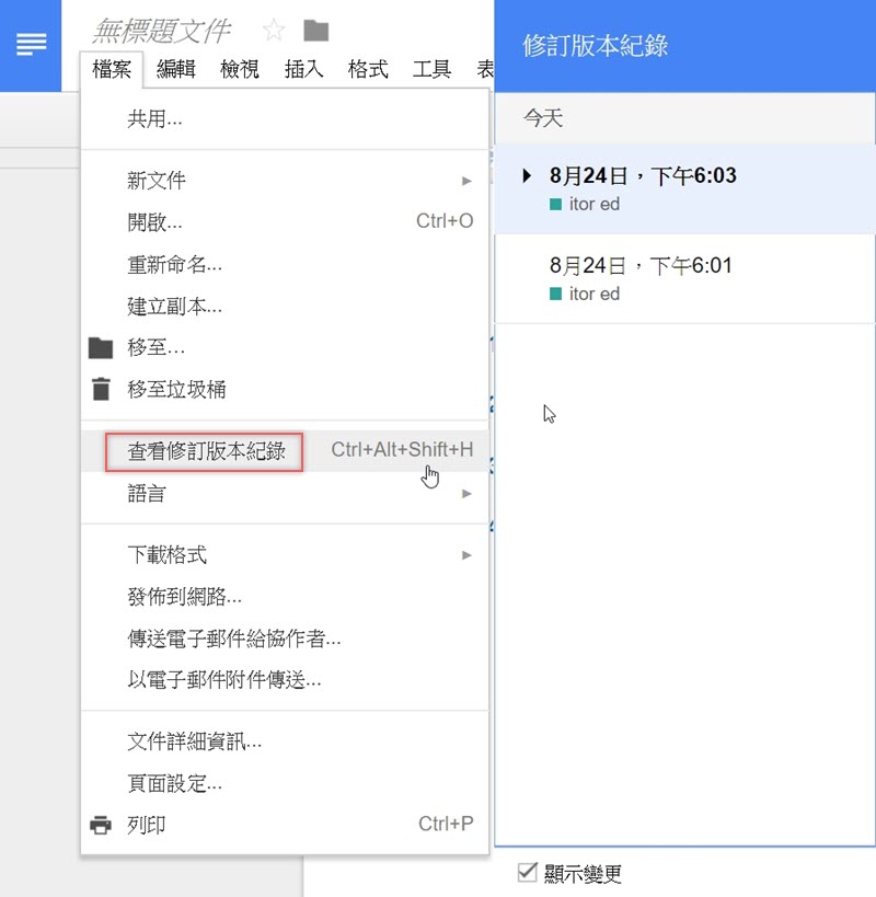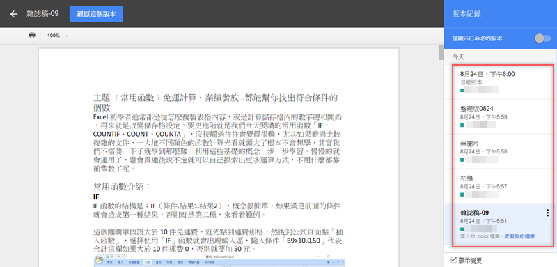 如果你的還是舊版,就會像下圖點「查看修訂版本記錄」後,只會顯示日期與時間,無法命名,新版就很清楚了。