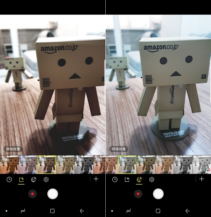 前鏡頭的操作介面同樣是上下左右,往左是功能選擇,包括很好用的超廣角自拍、景深模式以及全視角,往右同樣有很多濾鏡可以即時套用拍攝,對於自拍有大加分的效果。