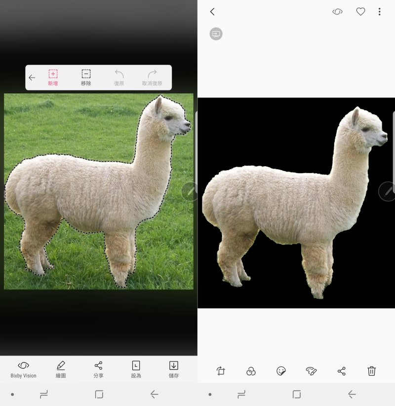 然後就會自動將畫面上的主體精準的圈選起來,如果有誤差的話,你只要再利用新增/移除的方式進行調整,最後儲存後就可以了,如果畫面沒太複雜的話,一張圖片簡單的去背應該不用 10 秒吧。
