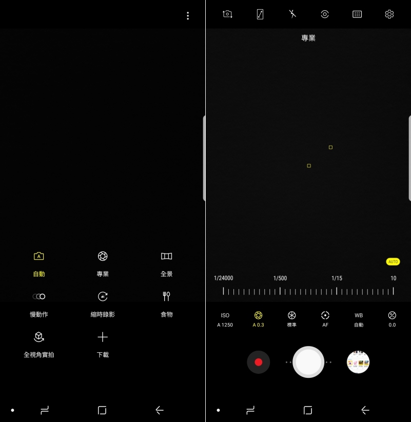 相機介面採用上下左右滑動切換,往左可以切換各種相機模式,拍攝夜景的利器專業模式最長可嚗光 10 秒。