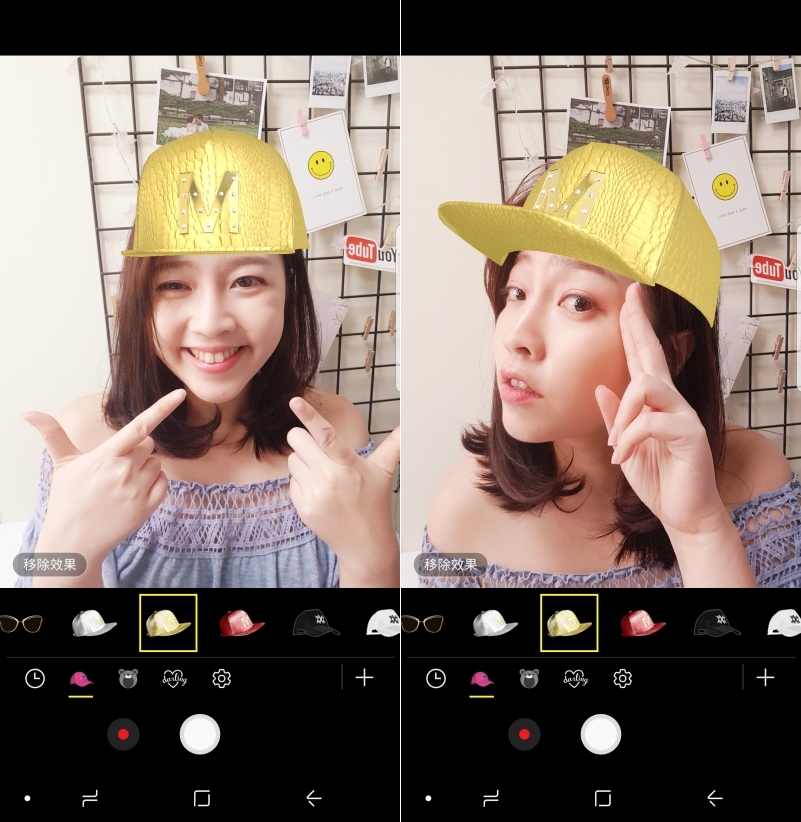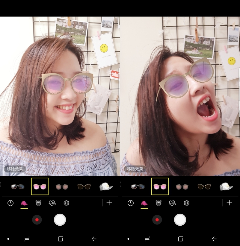 自拍最有趣的部份是趣味造型,像是這眼鏡,選擇之後會自動幫你加到畫面上,而且隨著頭擺動也會自動調整角度,就像真的戴著眼鏡一樣啊。