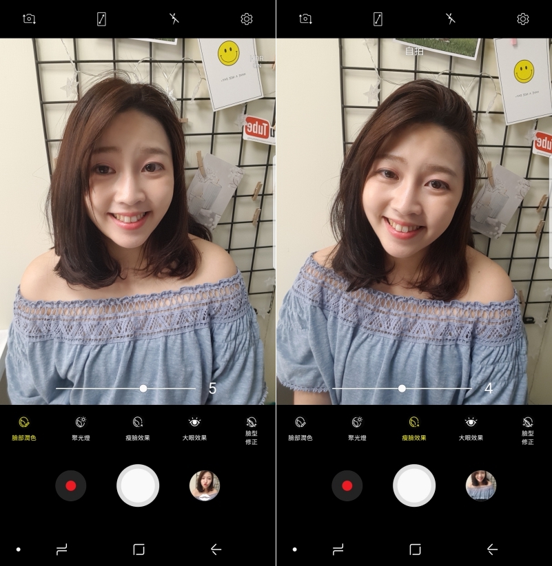 美顏自拍模式中可以調整的包括臉部潤色、聚光燈、瘦臉效果、大眼效果以及臉型修正,其中臉部潤色、瘦臉以及大眼分別都有八段的效可以使用,阿湯覺得開到 4 都還蠻自然的。
