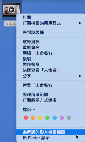 完成後的檔案是 MOV 檔,如果要改成 MP4 檔,先點右鍵找到「為所選的影片檔案編碼」。