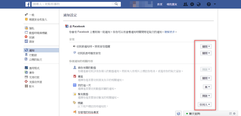 這裡就是所有通知的設定區域了,可以先關閉通知和訊息的音效,再來就是壽星、我的這一天、標籤、粉絲專頁和社團等,點開選單即可設定。