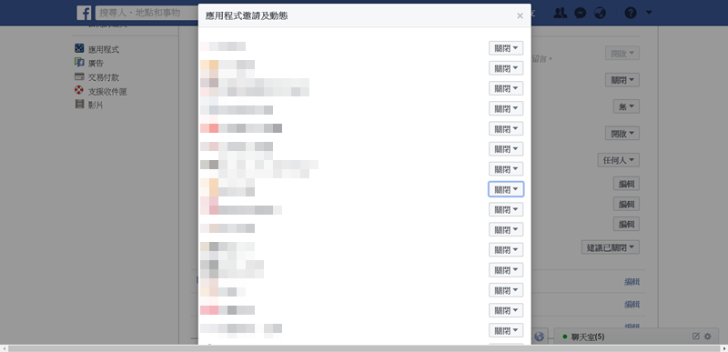 應用程式邀請及動態應該蠻多人需要設定的,你可能開啟這裡才發現自己下載了那麼多應用程式,不只遊戲還有一些做過的測驗等等,一一點關閉吧,可惜沒有一鍵關閉,如果你有幾十個幾百個,就找到最吵的那個關掉吧。