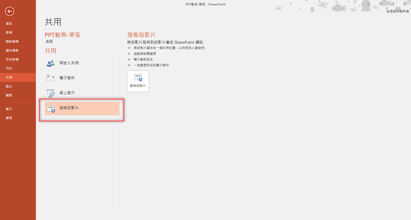 步驟相當簡單,先到檔案的地方找到「共用」,進來後選擇「發佈投影片」。