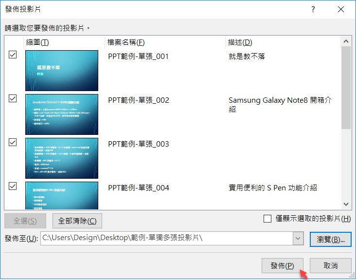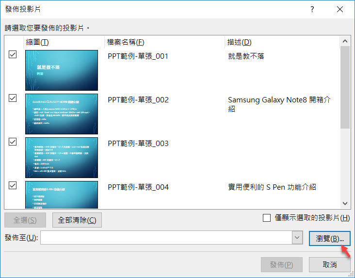 出現檢視視窗,將所有投影片全選(如果是其中幾張就選那幾張即可),然後點瀏覽。