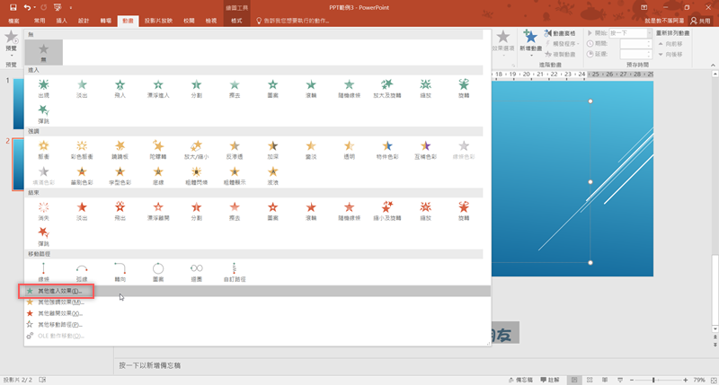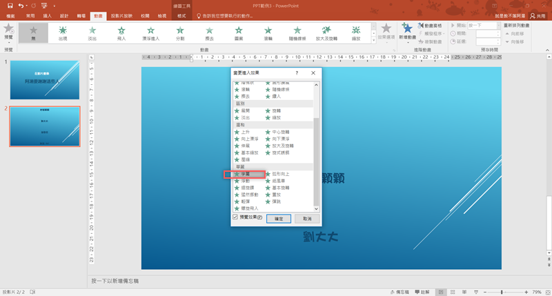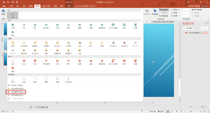 如果你的 PowerPoint 版本比較舊,沒有字幕選項,也可以利用其他動畫製造類似的效果,像是「其他結束效果」。