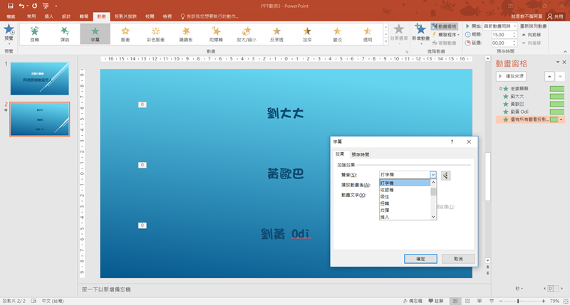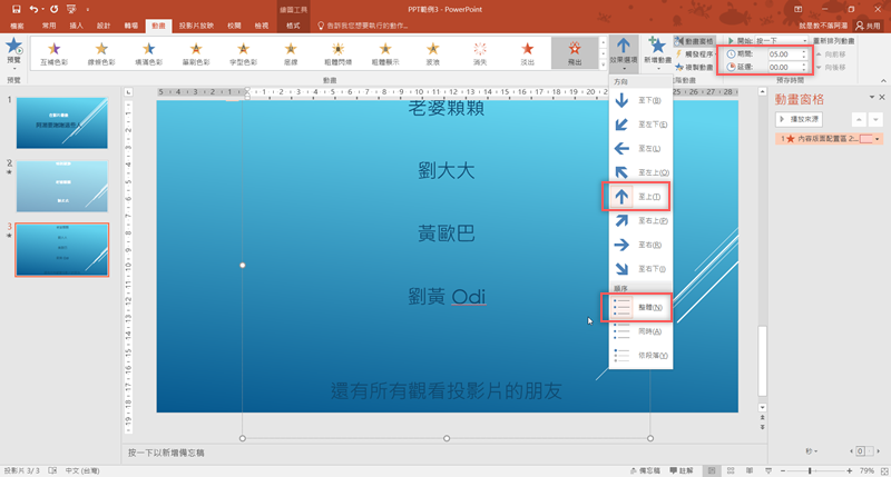 現在 PowerPonit 高手如林,聽說有的提案現場都在比誰做的簡報檔最有特色(比提案內容更引人注目…),不知道大家在簡報的最後一張都放什麼呢?無論多精彩的簡報,看到最後也是會累的,除了放上一張謝謝觀賞之類的句子,也可以利用動畫效果,列出工作團隊或是要感謝哪些人,再讓這些文字一行行往上跑,就像很多影片結尾那樣,一定會讓觀眾的印象更為深刻,搭配音樂效果更佳。