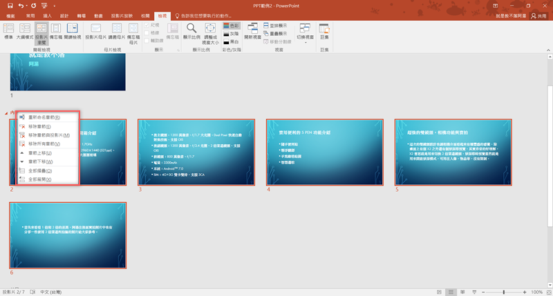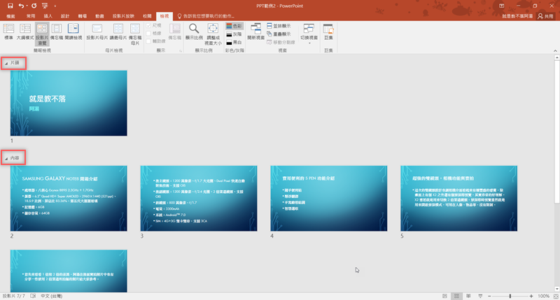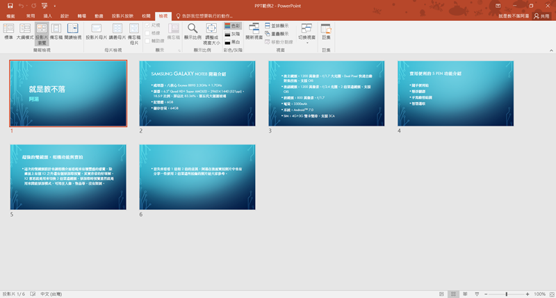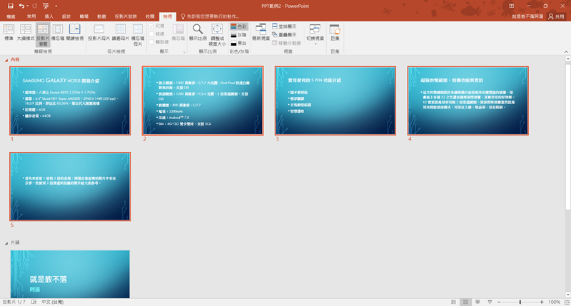 先切換到檢視,點投影片瀏覽,假設要調整的是這六張投影片(範例用得比較少張,但原理是相同的)。