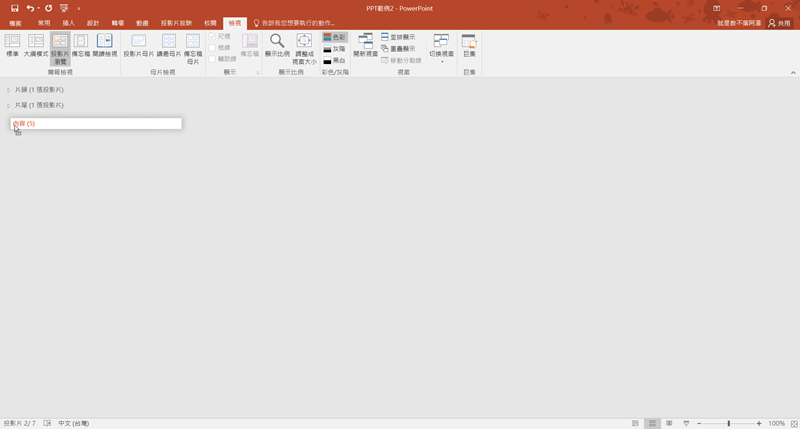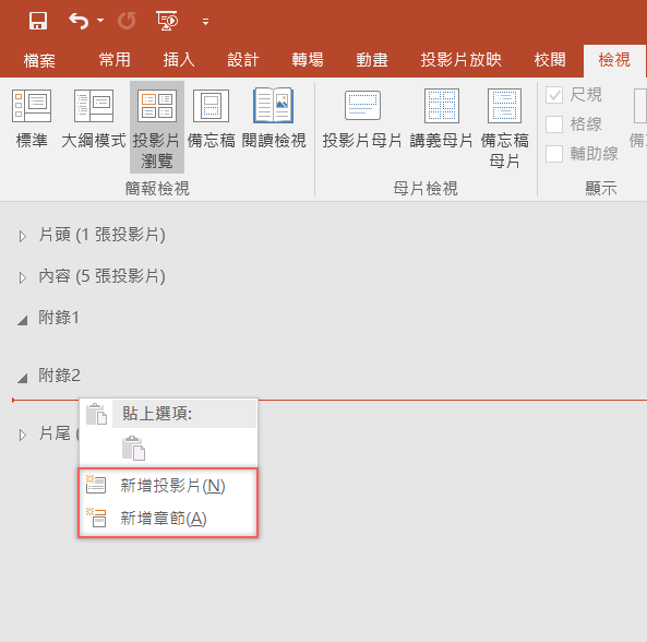 在空白處隨意一點即可新增投影片或章節,這樣子整理起來就很方便,像阿湯又在內容底下加入了附錄 1、附錄 2 兩章,這樣就可以從瀏覽這邊先新增投影片,再標準模式來編輯,既方便又不容易搞錯。
