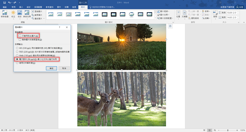 處理多張圖片就取消勾選「只套用到此圖片」,假設這份文件要當作電子郵件的附檔,就建議最小化文件以進行共用。