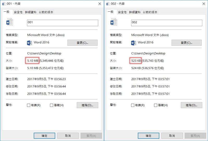 比較一下文件大小就知道,左邊是沒縮圖過、右邊是最小化,差異相當大。