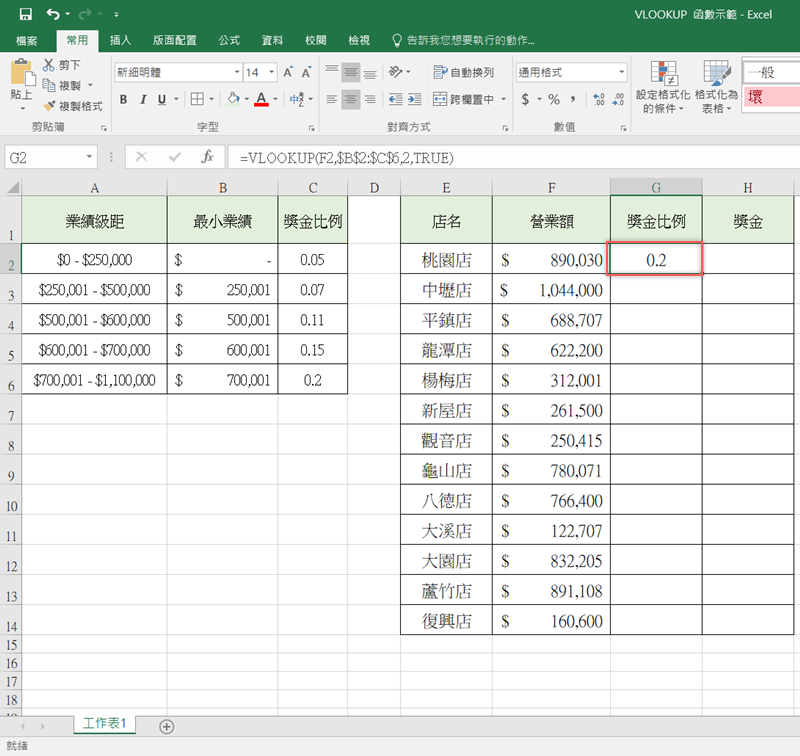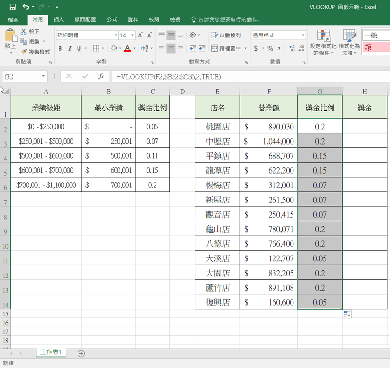 假設今天要示範業績獎金的發放比例,需要兩個表單,一個是業績的數字範圍可以抽多少%數,這種「對照」用的表格,另一個就是做了多少業績、所以獎金是多少%、最後可以得到多少金額這種「呈現結果」的表格,如下圖,我們先來看「獎金比例」這一格。