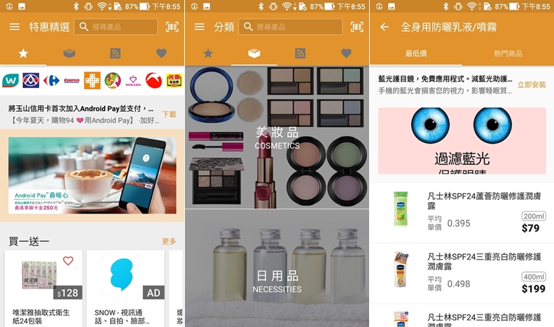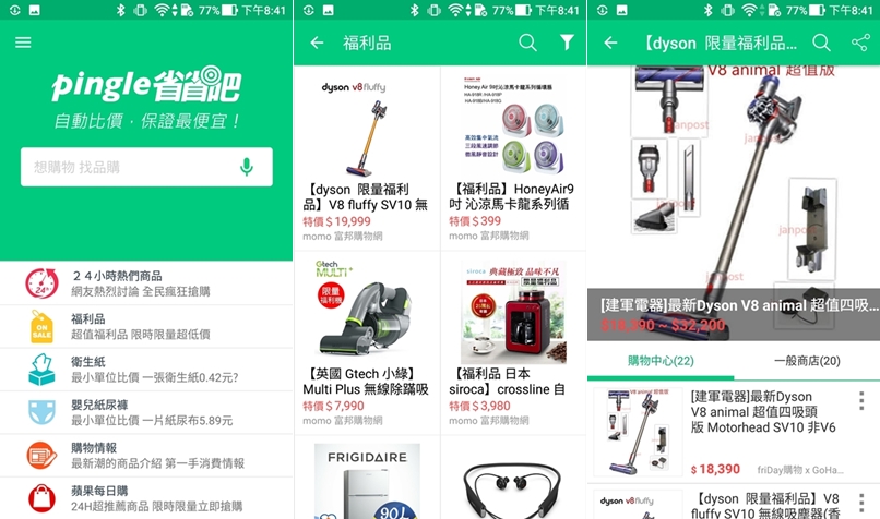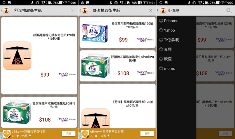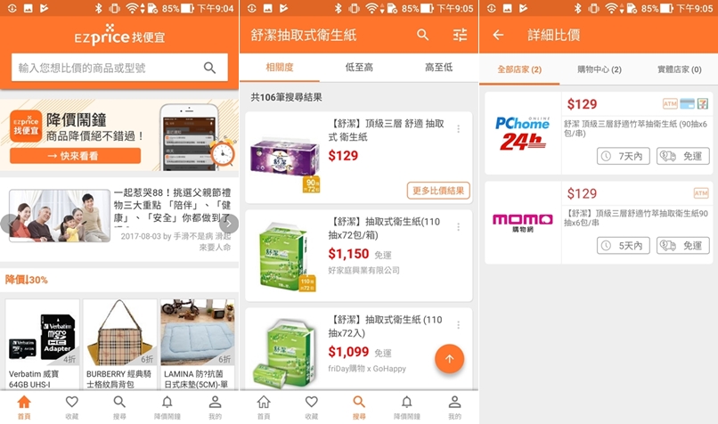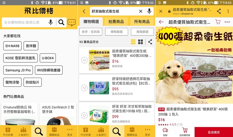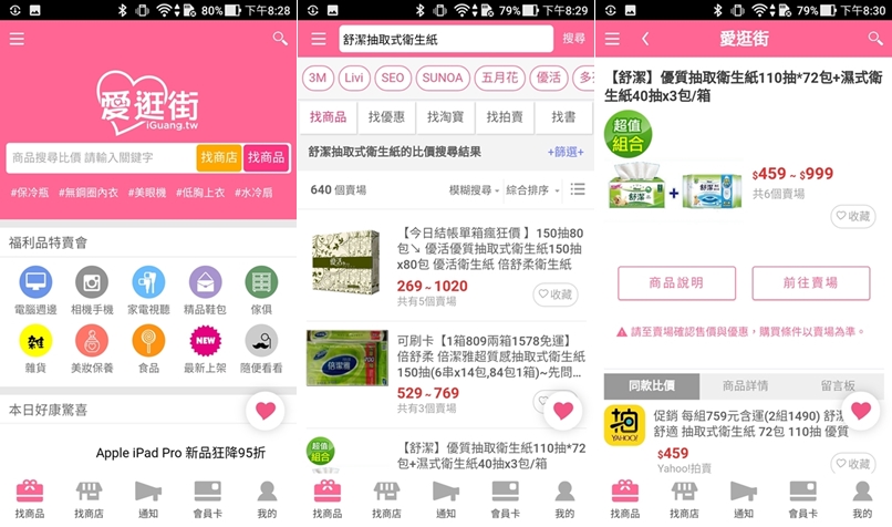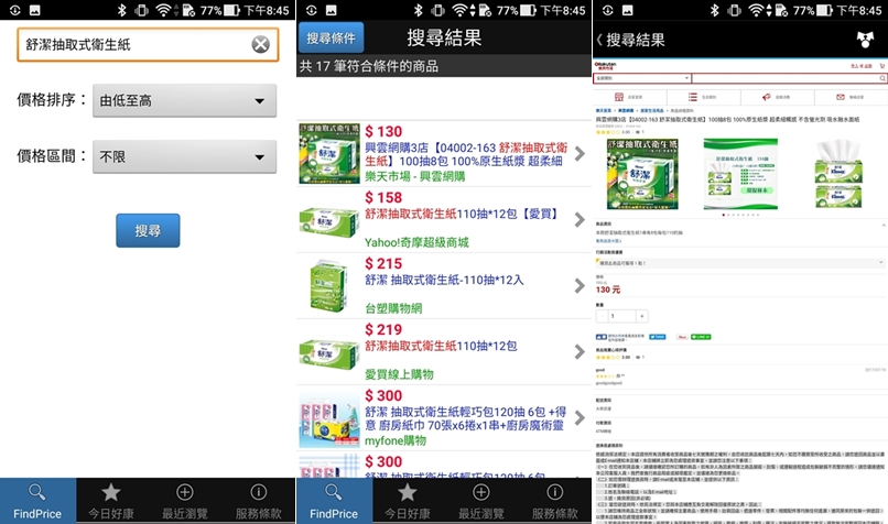 這款內容蠻豐富的,首頁除了搜尋列還有福利品、每日好康、消費相關新聞,但輸入關鍵字發現前面兩樣都不是阿湯要的結果,而是其他牌子的衛生紙,雖然列出來的商品資訊很清楚,但廣告實在有點多。