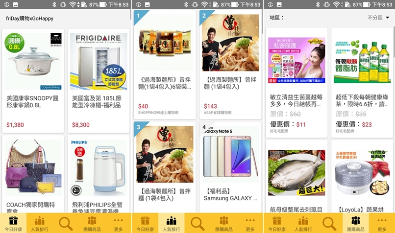 除了幫你找到要買的項目外,還可切換到今日好康、人氣排行,以及團購商品,內容都來自各大購物網,直接線上就可以買了。