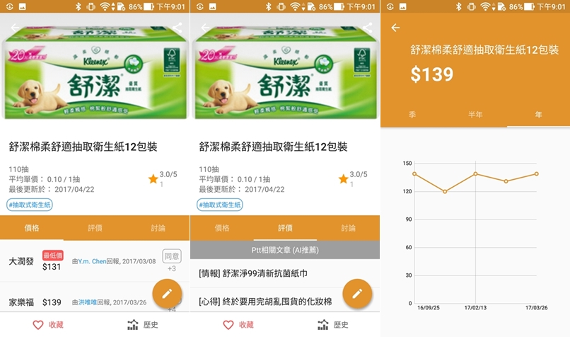 商品的單位、平均單價、最後更新日都有詳細列出,因為是由網友上傳價格與分享資訊,還能看到相關評價做為購買參考,並提供歷史價格走勢圖。