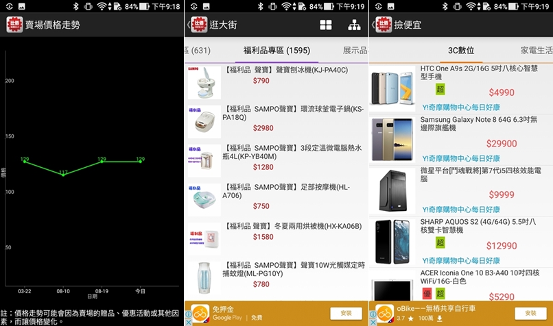 也可點進走勢圖可觀察價格變化,另外還有福利品專區和各大賣場的每日好康,類別蠻豐富的。