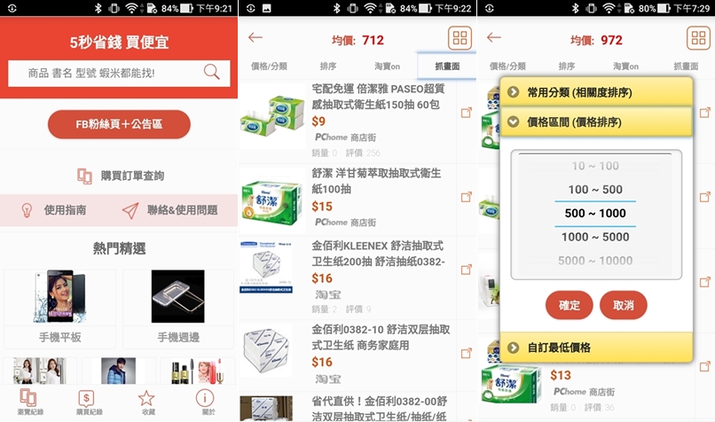 這款的特色是除了常見的線上購物,還可點「淘寶 on」讓大陸淘寶網的搜尋結果一併顯示出來,另外像分類或價格區間設定也很彈性。