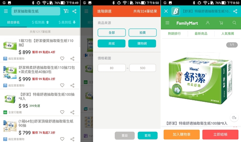同樣都是用舒潔抽取式衛生紙來做示範,輸入關鍵字後跑出來的結果也不少,預設是依相關度,也可切換成價格,點進去會列出賣場和價格的效期、運費。