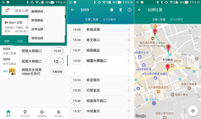 將常用的站牌、路線收錄進群組,下次要用就很方便,想要去哪裡也能使用路線規劃,看坐哪個路線的公車比較快又順路。