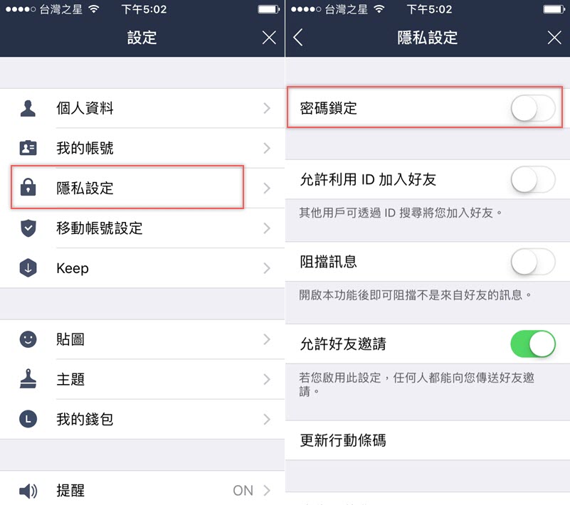 接著開啟 LINE 到設定 → 隱私設定,將「密碼鎖定」關閉。
