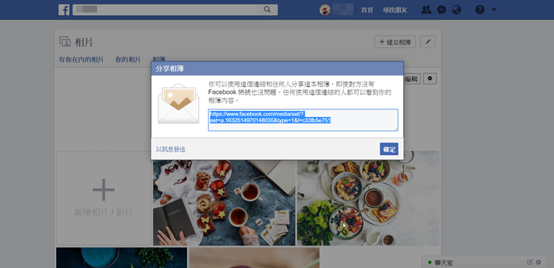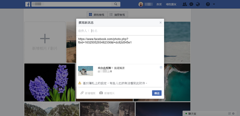 要分享給臉書上的朋友,就在上一步點左下角的「以訊息發送」即可,但如果你的相片或相簿本來就有隱私限制,就要記得調整,不然對方還是看不到的。