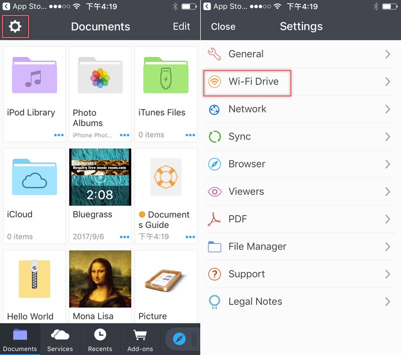 Documents 是一款檔案管理 APP,可用來查看 iPhone 裡的文件,安裝後開啟點左上角齒輪圖示,選「Wi-Fi Drive」。