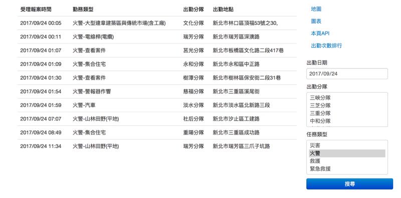 只要進入該網站就能直接看見新北市所有即時的消防隊員出勤紀錄,任務類型主要分為災害、火警、救護、緊急救援四大項目,在勤務類型中還會有著重點註明,例如跳水、車禍、住宅區失火等,後方則是出勤的分隊與地點。