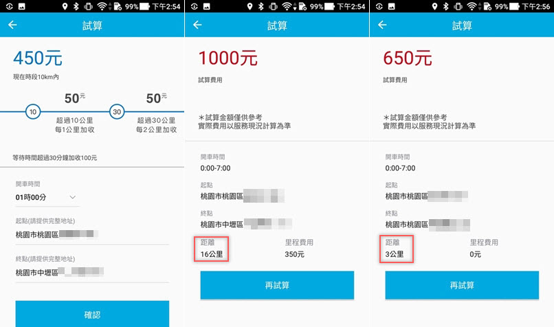 再試另一個例子,用應該最「熱門」的凌晨一點好了,16 公里多了一項里程費用,加起來要 1000 元,3 公里也要 650 元,但有需求真的不能省,安全最重要。