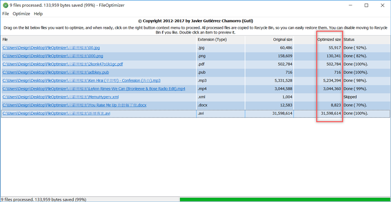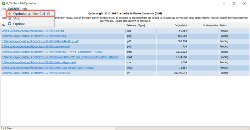 點Optimize →「Optimize all files Ctrl+O」開始最佳化程序。