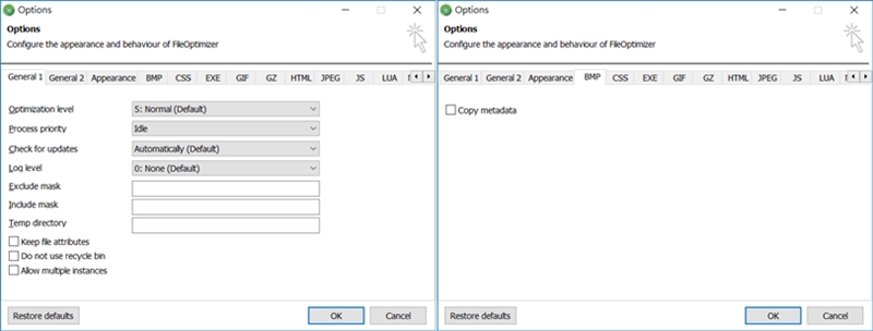 左上角 Optimize → Options 開啟設定,這裡可以進階調整各項功能及不同檔案類型的細節,包括自動更新、壓縮程度、複製原始數據等等。