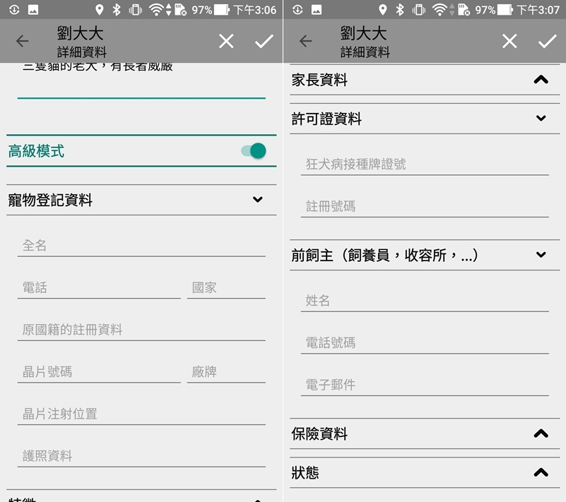 再來的是基本資料,可輸入毛色、是否節育、筆記,打開高級模式還有寵物的登記資料、家長、保險及許可證資料等可編輯。