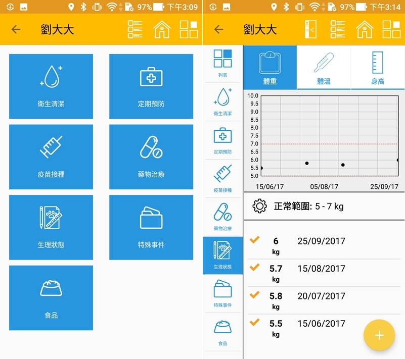 日常護理有衛生清潔、定期預防、疫苗接種、藥物治療、生理狀態和特殊事件皆可記錄,例如體重的正常範圍和變化。