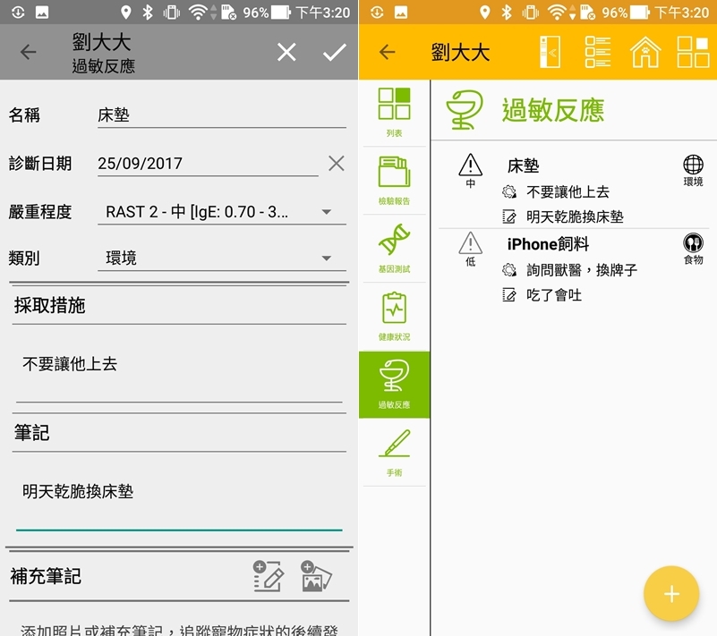 對什麼過敏、嚴重程度、採取措施等也能一項項加進去。