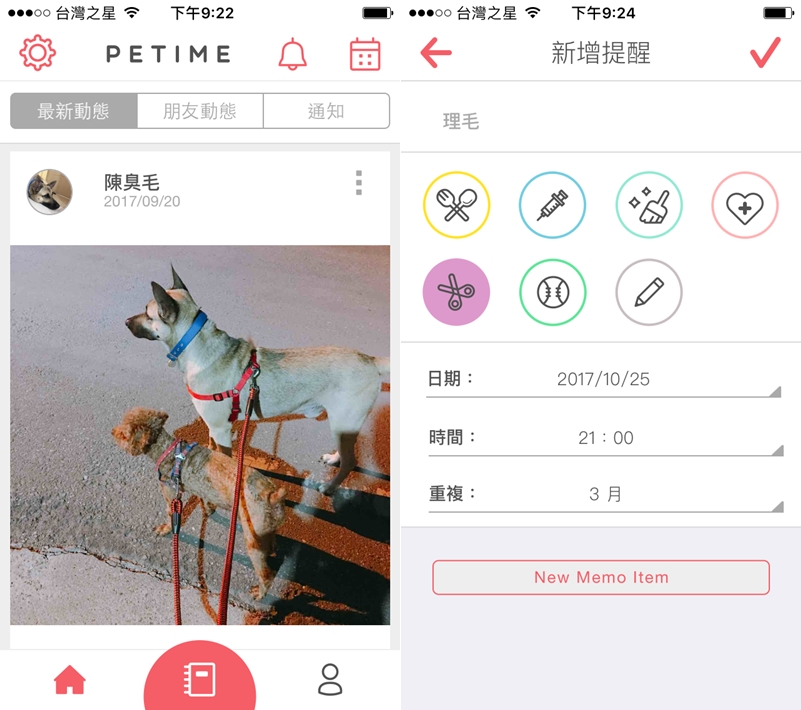 寵物日記可發到社群分享,或瀏覽其他網友發表的動態消息,另外像理毛、打針、餵食等活動也能設提醒時間和重複頻率,差別只是內容沒辦法紀錄那麼詳細。
