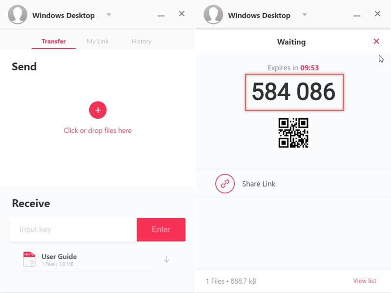 安裝完電腦版,先來試試將檔案從電腦傳到 Android 手機(記得要下載 APP),開啟後直接將檔案拖進視窗,會產生一組六位數代碼,並提示要在 10 分鐘內下載完成不然會失效。