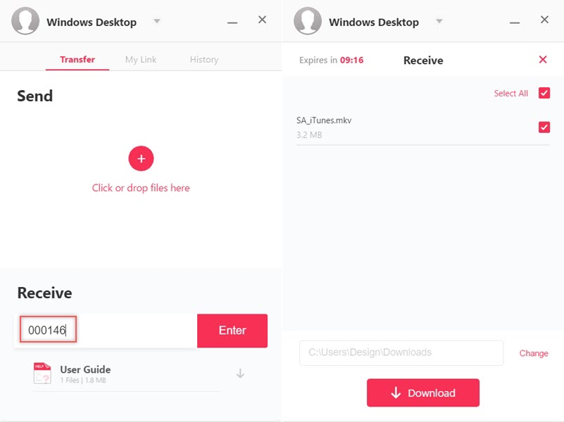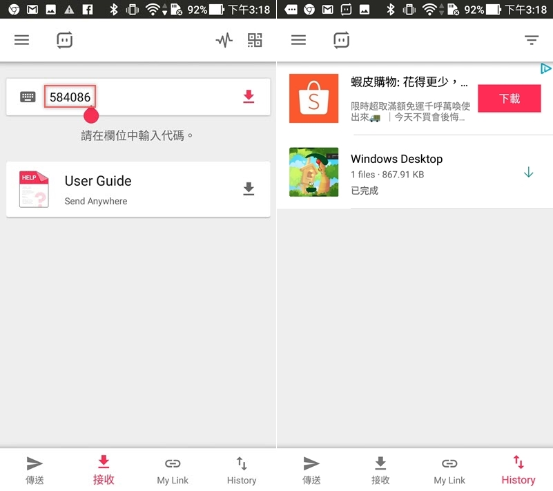 在電腦版下方「Receive」列輸入代碼後 Enter,確認下載路徑後點 Download 即可,這次檔案比較大,3.2MB 花大概 4 秒。