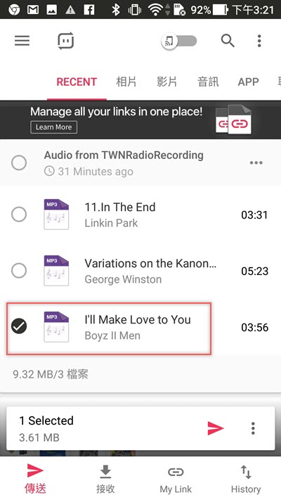 再來看 Android 手機傳到 iPhone,選擇檔案後點傳送,這次用 MP3 檔。