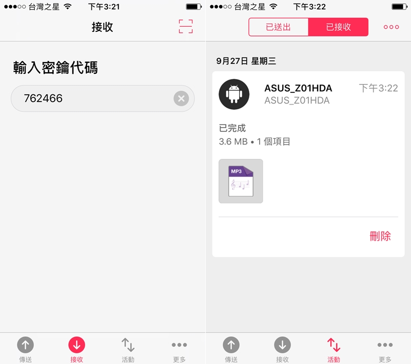 拿出接收端的手機輸入代碼,完成接收後還能直接開啟瀏覽、播放收到的音樂。