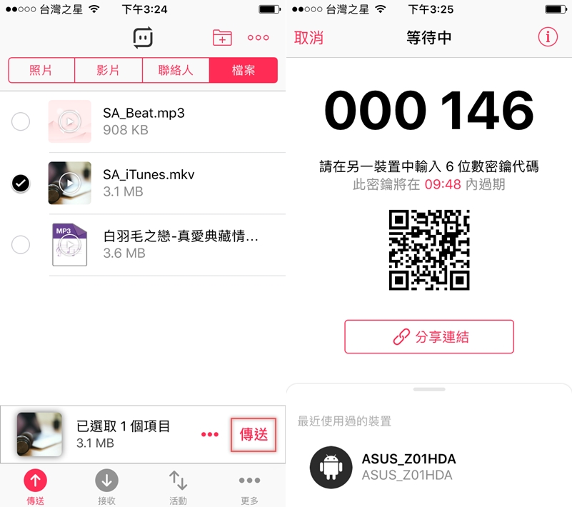 最後將 iPhone 裡的影音檔傳到電腦好了,一樣點傳送後生成六位數代碼。